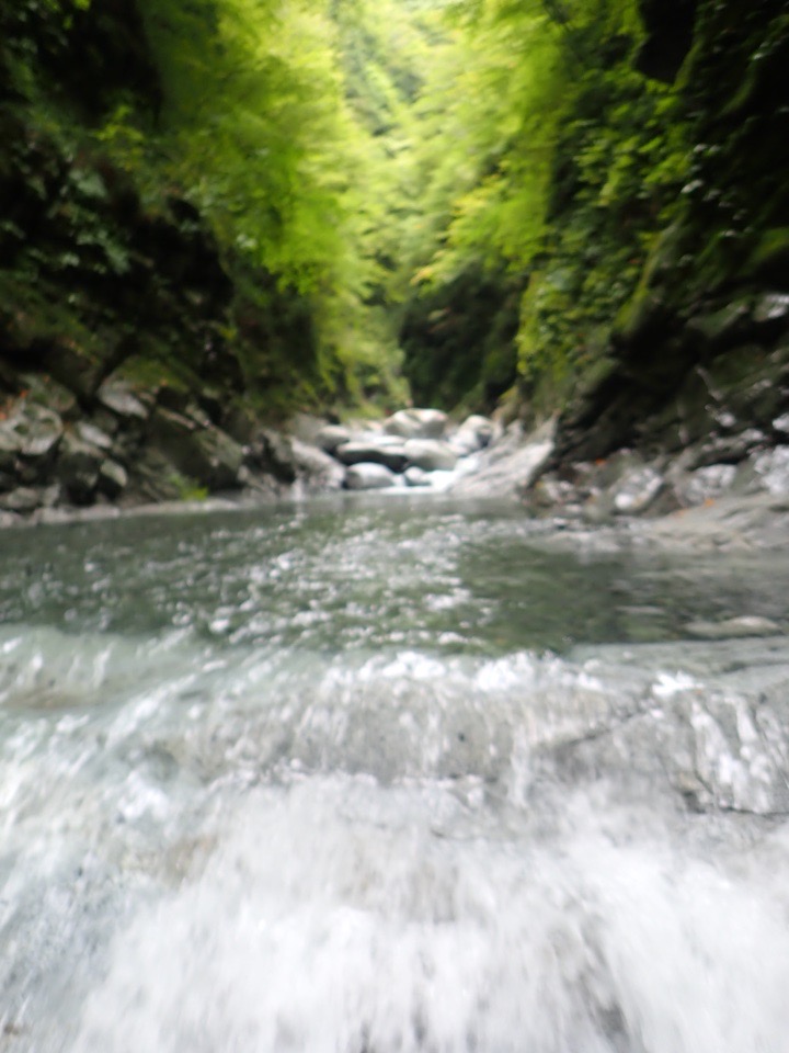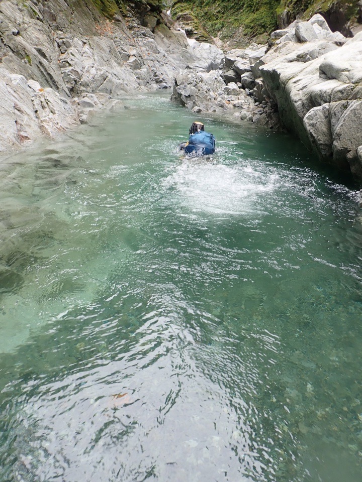 泳いで突破する予定のところが増水のため泳げず、岩登って突破しか方法がなく、急にクライミング要素強めになる。