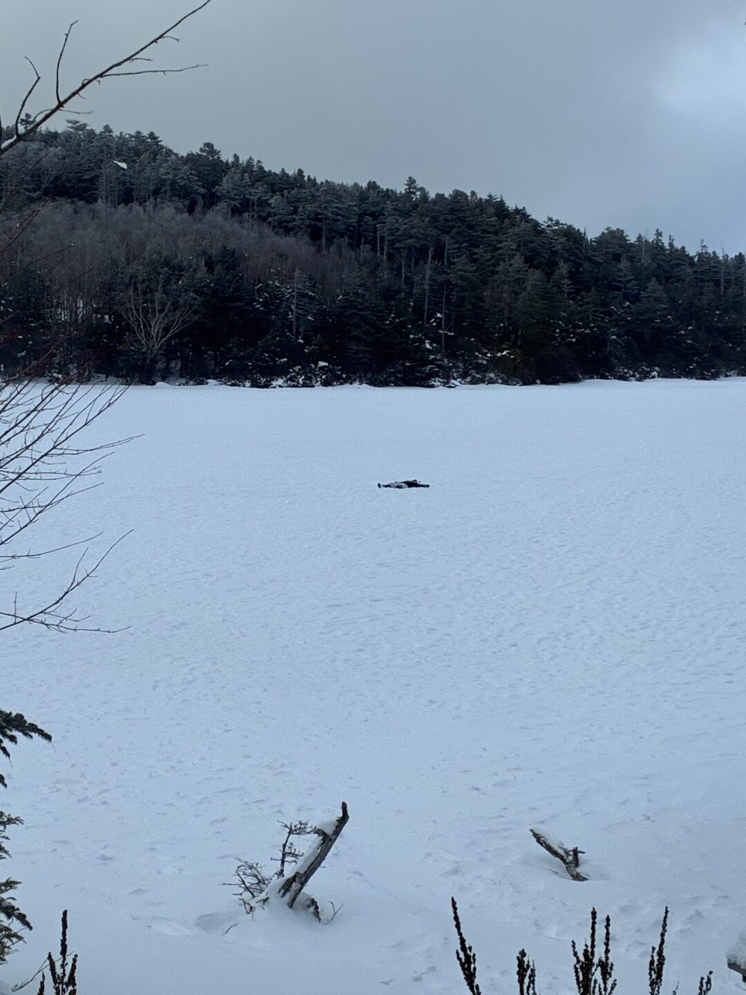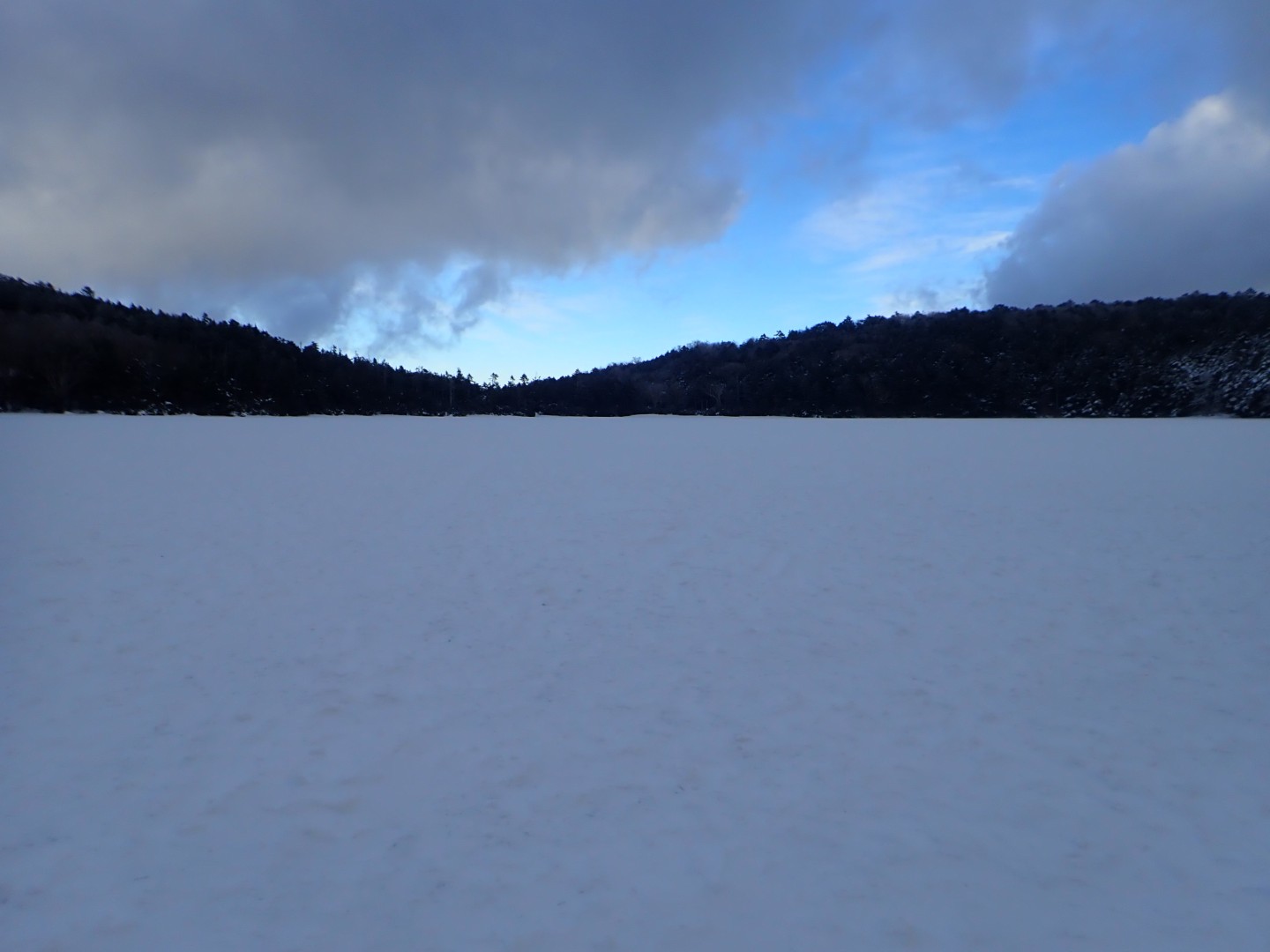 凍った池の上に新雪ふわふわ