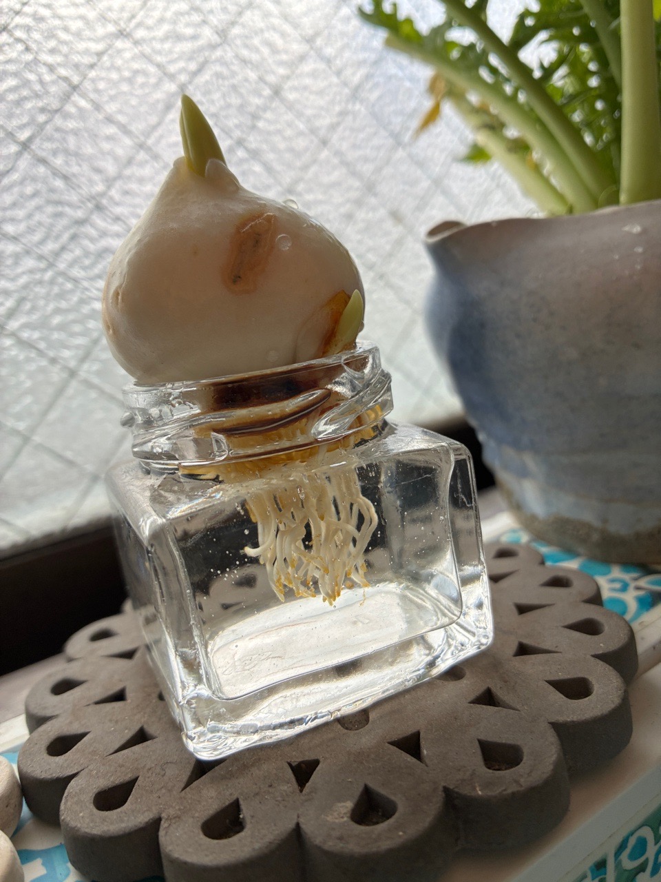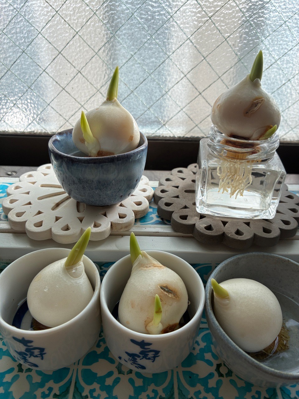 よく見たら他の子も芽が出てきて、卵パックじゃキツそうだったので、ぐい吞みにイン。
