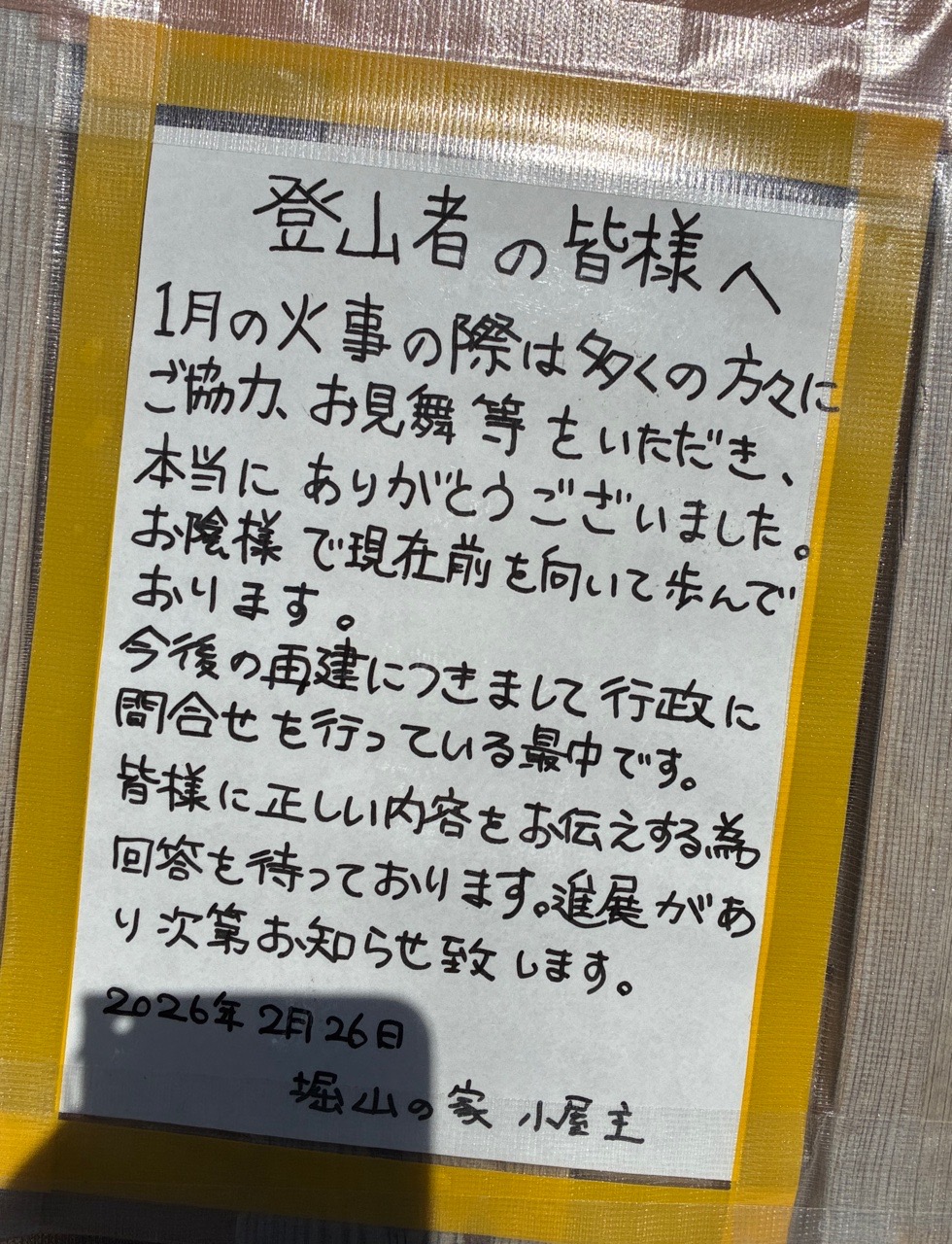堀山まで降りると、小屋の関係者の方が「ここは何メートルで~」とお話されていました。おっ!再建するんですか!