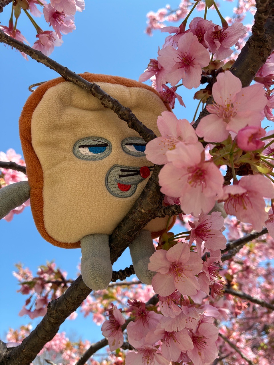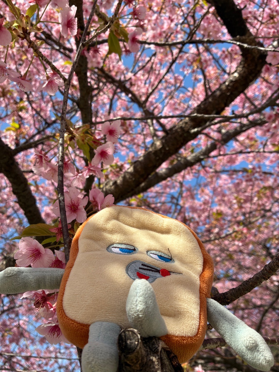 次のバスまで15分あったので、河津桜とパンどろぼうと戯れました。